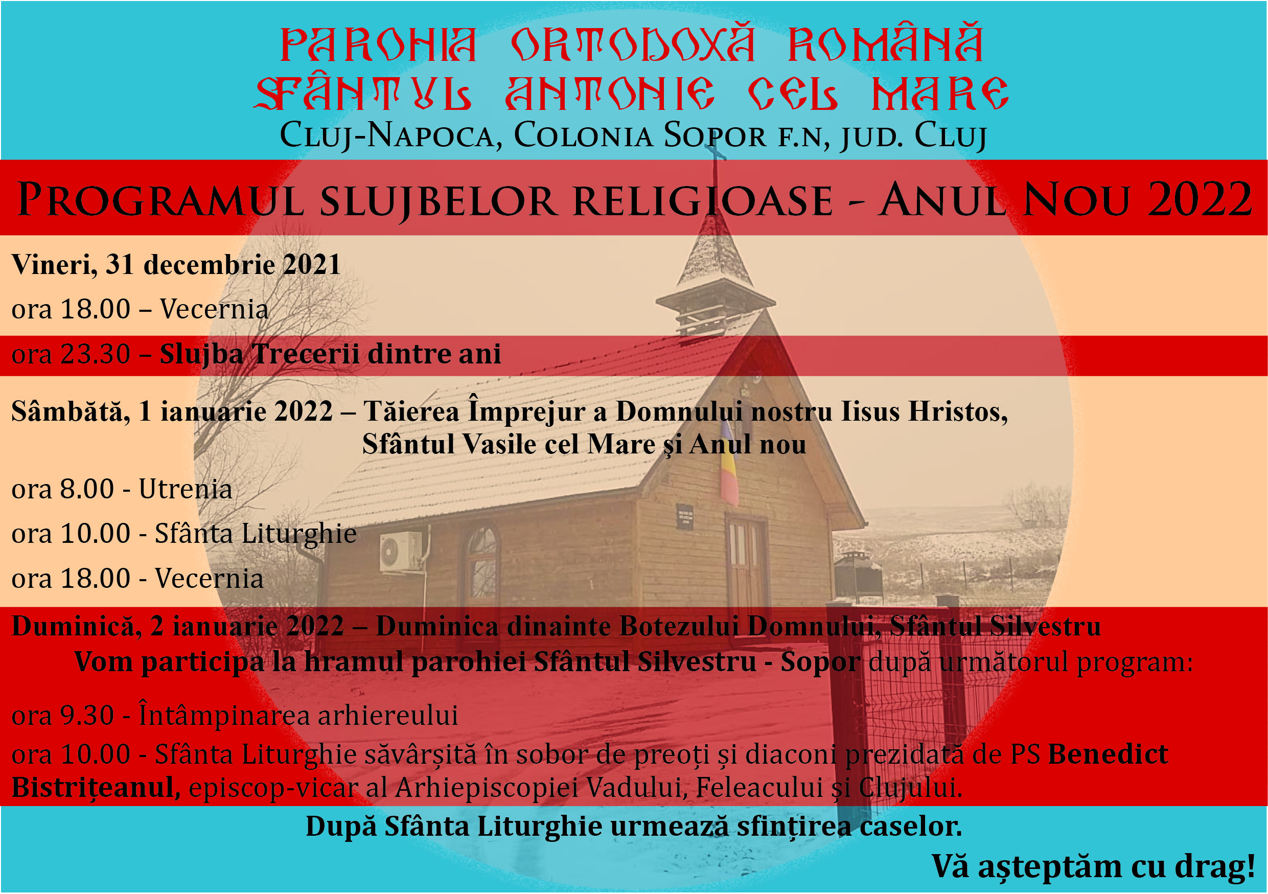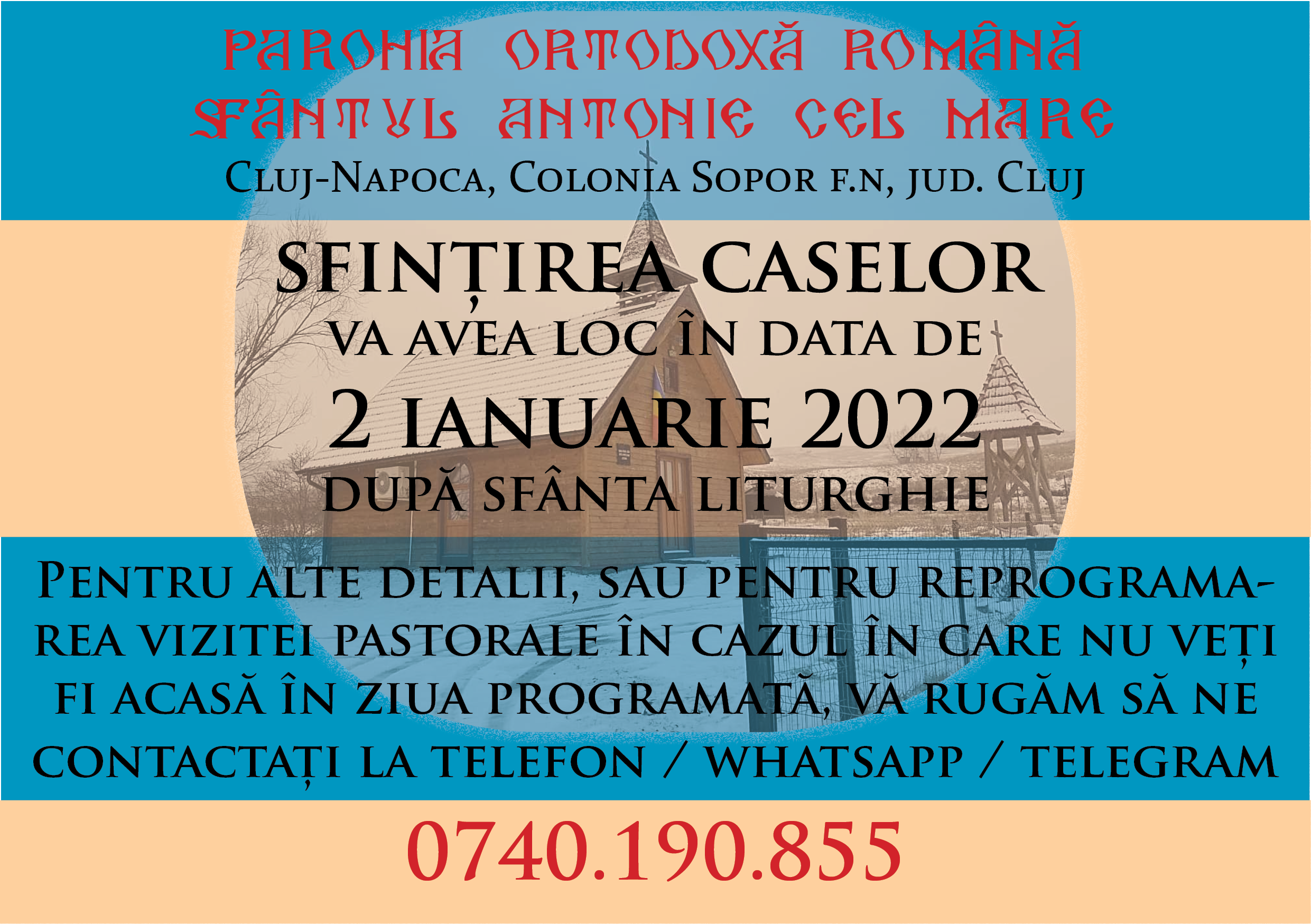 În Parohia Ortodoxă Română Sfântul Antonie cel Mare Cluj-Napoca, Colonia Sopor f.n, jud. Cluj, sfinţirea caselor va avea loc în data de 2 ianuarie 2022, după Sfânta Liturghie. Pentru alte detalii, sau pentru reprogramarea vizitei pastorale în cazul în care nu veți fi acasă în ziua prog...
